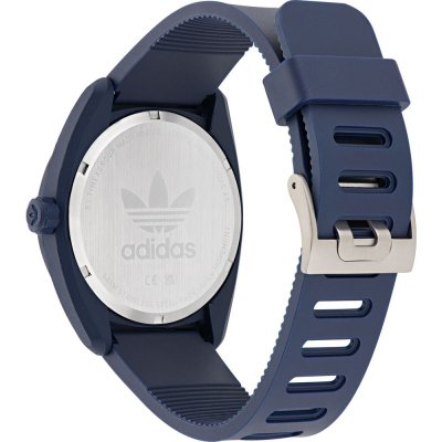 This Adidas watch has a case made of BioCeramic with a diameter of 44 mm and is fitted with a Bio-sourced resin strap. Inside the case lies a Timex movement and the watch features a Mineral crystal.