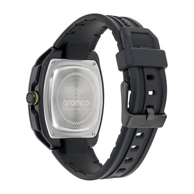 This Aston Martin watch has a case made of Resin with a diameter of 44 mm and is fitted with a rubber strap.