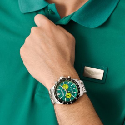 This Aston Martin watch has a case made of Steel silver with a diameter of 44 mm and is fitted with a Steel silver strap. Inside the case lies a Timex movement and the watch features a Mineral crystal.