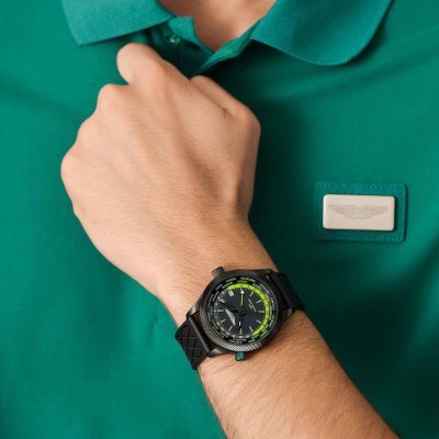 This Aston Martin watch has a case made of Steel silver with a diameter of 41 mm and is fitted with a rubber strap. Inside the case lies a Timex movement and the watch features a Mineral crystal.
