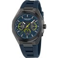 This Aston Martin watch has a case made of Steel silver with a diameter of 42 mm and is fitted with a rubber strap. Inside the case lies a Timex movement and the watch features a Mineral crystal.