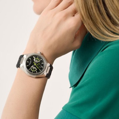 This Aston Martin watch has a case made of Steel silver with a diameter of 42 mm and is fitted with a rubber strap. Inside the case lies a Timex movement and the watch features a Mineral crystal.