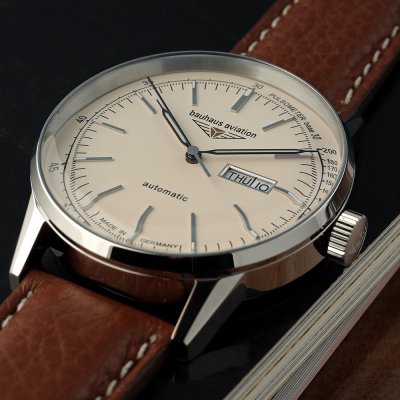 This Bauhaus watch has a case made of Steel silver with a diameter of 42 mm and is fitted with a leather strap. Inside the case lies a Miyota movement and the watch features a K1 Mineral crystal.