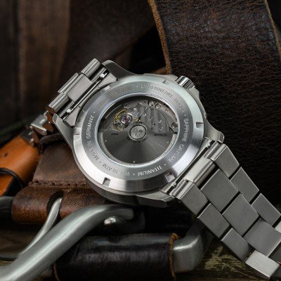 This Bauhaus watch has a case made of Titanium with a diameter of 42 mm and is fitted with a Titanium strap. Inside the case lies a Miyota movement and the watch features a Sapphire crystal.