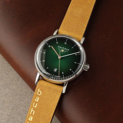 This Bauhaus watch has a case made of Steel silver with a diameter of 36 mm and is fitted with a leather strap. Inside the case lies a Ronda movement and the watch features a K1 Mineral crystal.