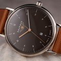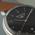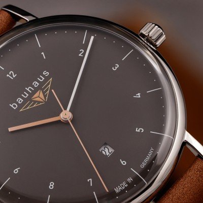 This Bauhaus watch has a case made of Steel silver with a diameter of 41 mm and is fitted with a leather strap. Inside the case lies a Ronda movement and the watch features a K1 Mineral crystal.
