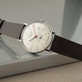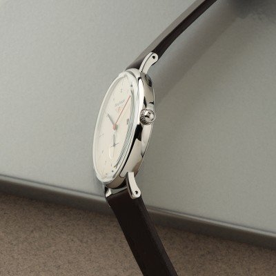 This Bauhaus watch has a case made of Steel silver with a diameter of 41 mm and is fitted with a leather strap. Inside the case lies a Ronda movement and the watch features a K1 Mineral crystal.