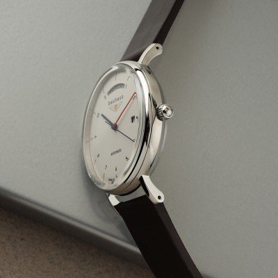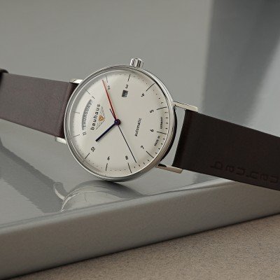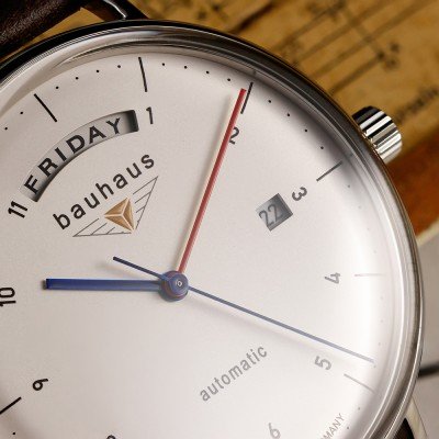 This Bauhaus watch has a case made of Steel silver with a diameter of 41 mm and is fitted with a leather strap. Inside the case lies a Miyota movement and the watch features a K1 Mineral crystal.