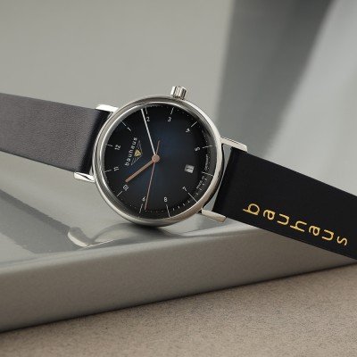 This Bauhaus watch has a case made of Steel silver with a diameter of 36 mm and is fitted with a leather strap. Inside the case lies a Ronda movement and the watch features a K1 Mineral crystal.