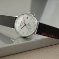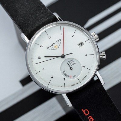 This Bauhaus watch has a case made of Steel silver with a diameter of 41 mm and is fitted with a leather strap. Inside the case lies a Seiko movement and the watch features a K1 Mineral crystal.