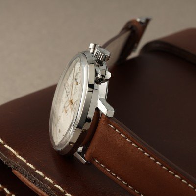 This Bauhaus watch has a case made of Steel silver with a diameter of 41 mm and is fitted with a leather strap. Inside the case lies a ETA movement and the watch features a K1 Mineral crystal.