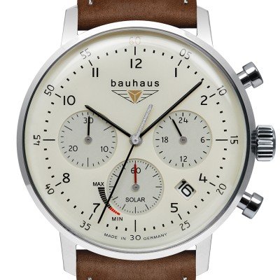 This Bauhaus watch has a case made of Steel silver with a diameter of 41 mm and is fitted with a leather strap. Inside the case lies a Seiko movement and the watch features a K1 Mineral crystal.