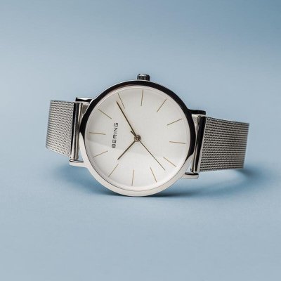 This Bering watch has a case made of Steel silver with a diameter of 36 mm and is fitted with a Metal strap. Inside the case lies a Miyota movement and the watch features a Sapphire crystal.
