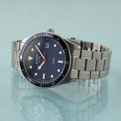 This Boccia watch has a case made of Titanium with a diameter of 39 mm and is fitted with a Titanium strap. Inside the case lies a Miyota movement and the watch features a Mineral crystal.