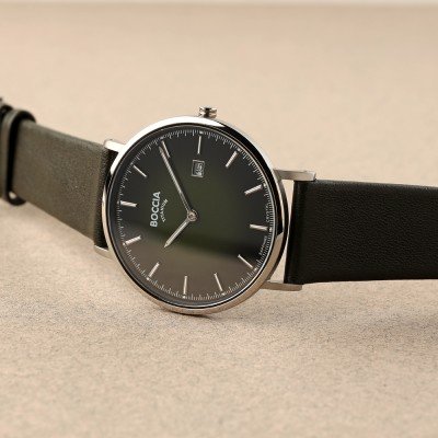 This Boccia watch has a case made of Titanium with a diameter of 39 mm and is fitted with a leather strap. Inside the case lies a Miyota movement and the watch features a Sapphire crystal.