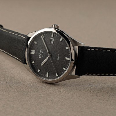 This Boccia watch has a case made of Titanium with a diameter of 39 mm and is fitted with a leather strap. Inside the case lies a Miyota movement and the watch features a Mineral crystal.