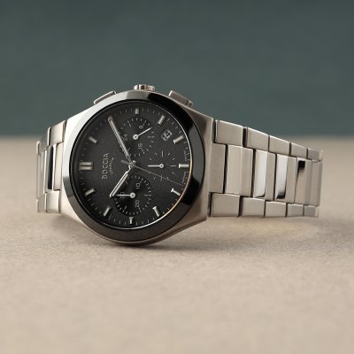 This Boccia watch has a case made of Titanium with a diameter of 39 mm and is fitted with a Titanium strap. Inside the case lies a Miyota movement and the watch features a Sapphire crystal.