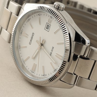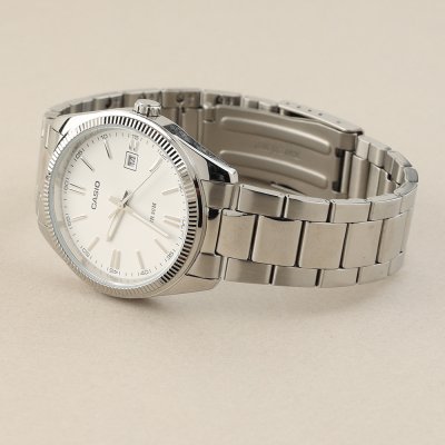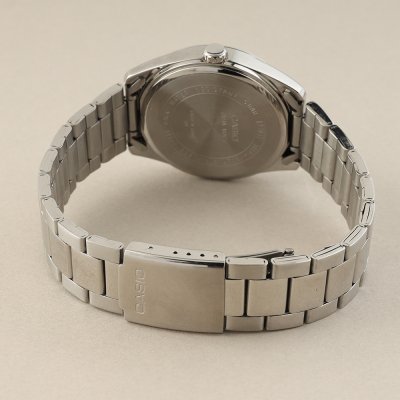 This Casio watch has a case made of metal alloy with a diameter of 38.5 mm and is fitted with a Steel silver strap. Inside the case lies a Casio movement and the watch features a Mineral crystal.