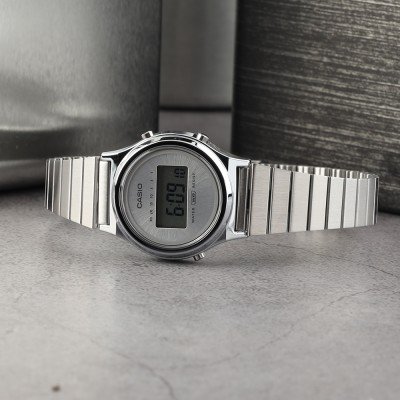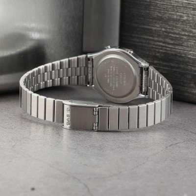 This Casio watch has a case made of Plastic / Resin with a diameter of 24.6 mm and is fitted with a Steel silver strap. Inside the case lies a Casio movement and the watch features a Acrylic crystal.