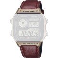 This Casio watch has a case made of Plastic / Resin with a diameter of 42.1 mm and is fitted with a leather strap. Inside the case lies a Casio movement and the watch features a Acrylic crystal.