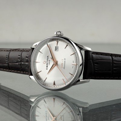 This Certina watch has a case made of Steel silver with a diameter of 40 mm and is fitted with a leather strap. Inside the case lies a ETA movement and the watch features a Sapphire crystal.