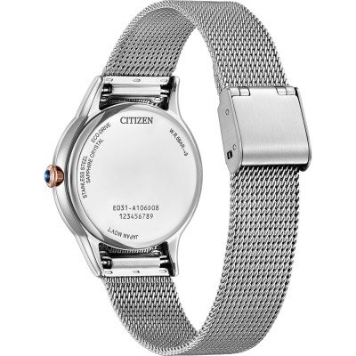 This Citizen watch has a case made of Steel silver with a diameter of 32 mm and is fitted with a Steel silver strap. Inside the case lies a Citizen movement and the watch features a Sapphire crystal.