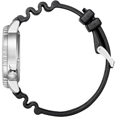 This Citizen watch has a case made of Steel silver with a diameter of 44 mm and is fitted with a rubber strap. Inside the case lies a Citizen movement and the watch features a Mineral crystal.