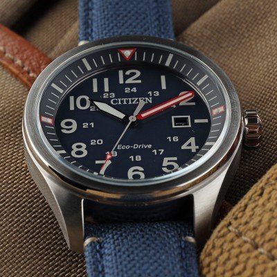 This Citizen watch has a case made of Steel silver with a diameter of 42.5 mm and is fitted with a Textile leather strap. Inside the case lies a Citizen movement and the watch features a Mineral crystal.