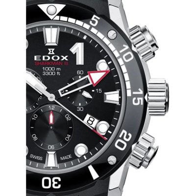 This Edox watch has a case made of Titanium with a diameter of 45 mm and is fitted with a rubber strap. Inside the case lies a Ronda movement and the watch features a Sapphire crystal.