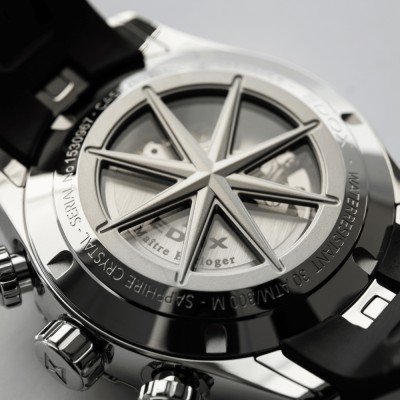 The Grand Ocean watch series is true to its yachting pedigree with an impressive 30 ATM water resistance and an automatic chronograph movement and inner bezel with tachymeter scale. Another striking feature is a compass rose case back with windows into the movement. The comfortable rubber strap with butterfly clasp snugly fits the ‘triple’ horn case. This is a distinctive design feature inspired by nautical engineering, providing a secure and ergonomic fit while adding distinctive look.