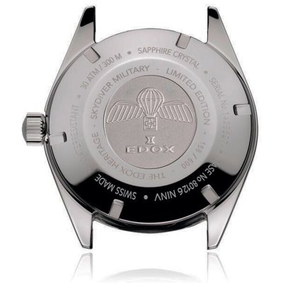 This Edox Skydiver watch is a true tribute to paratroopers. It is a limited edition of which there are only 600 numbered copies on the market. The watch comes with both a brown and weathered grey leather watch band that add to the watch’s vintage character. The beautiful leather watch roll in which the watch is delivered also has this vintage charm and enhances the aviation character of the watch.