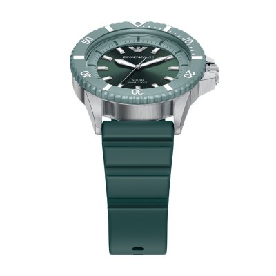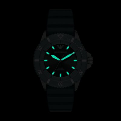 This Emporio Armani watch has a case made of Steel silver with a diameter of 42 mm and is fitted with a rubber strap. Inside the case lies a Miyota movement and the watch features a Mineral crystal.