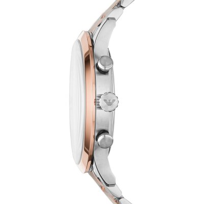 This Emporio Armani watch has a case made of Steel silver with a diameter of 44 mm and is fitted with a Steel silver strap. Inside the case lies a Miyota movement and the watch features a Mineral crystal.