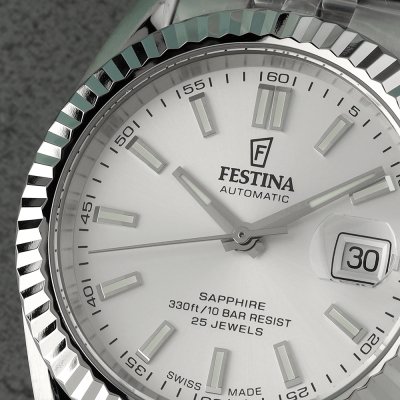 This Festina watch has a case made of Steel silver with a diameter of 41 mm and is fitted with a Steel silver strap. Inside the case lies a Soprod movement and the watch features a Sapphire crystal.