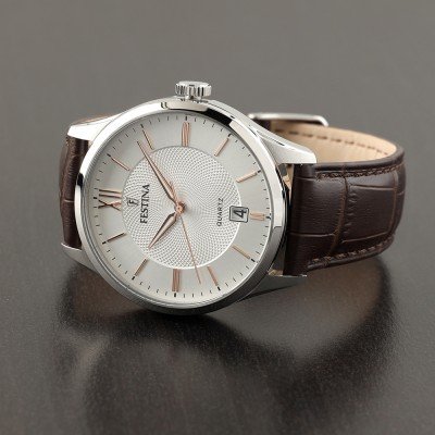 This Festina watch has a case made of Steel silver with a diameter of 43 mm and is fitted with a leather strap. Inside the case lies a Miyota movement and the watch features a Mineral crystal.