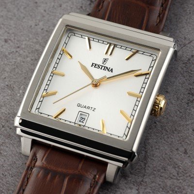 This Festina watch has a case made of Steel silver with a diameter of 39 mm and is fitted with a leather strap. Inside the case lies a Miyota movement and the watch features a Mineral crystal.