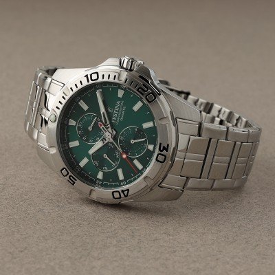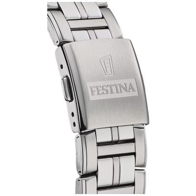 This Festina watch has a case made of Steel silver with a diameter of 43 mm and is fitted with a Steel silver strap. Inside the case lies a Miyota movement and the watch features a Mineral crystal.