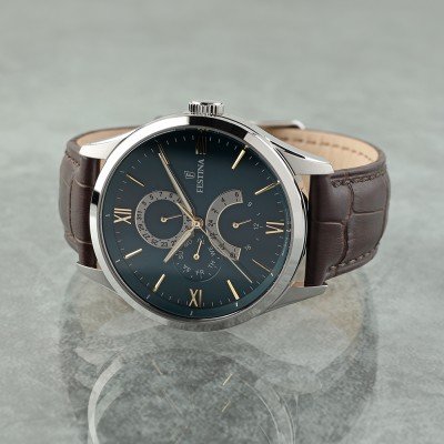 This Festina watch has a case made of Steel silver with a diameter of 43 mm and is fitted with a leather strap. Inside the case lies a Miyota movement and the watch features a Mineral crystal.