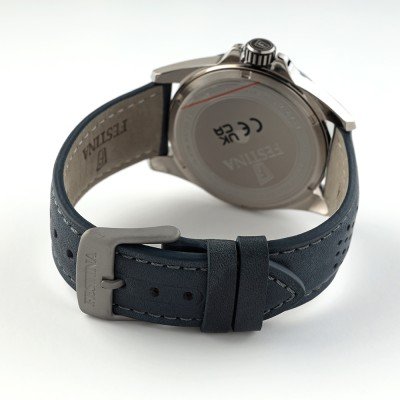 This Festina watch has a case made of Titanium with a diameter of 43 mm and is fitted with a leather strap. Inside the case lies a Miyota movement and the watch features a Mineral crystal.