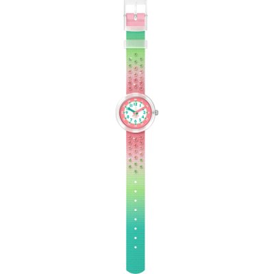 This Flik Flak watch has a case made of Bio-sourced resin with a diameter of 30 mm and is fitted with a textile strap. Inside the case lies a ETA movement and the watch features a Acrylic crystal.