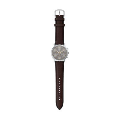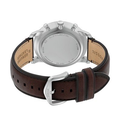 This Fossil watch has a case made of Steel silver with a diameter of 44 mm and is fitted with a leather strap. Inside the case lies a Miyota movement and the watch features a Mineral crystal.