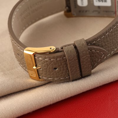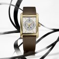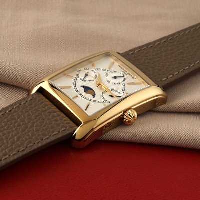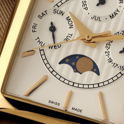 The Frederique Constant Classics Carrée Moonphase watch, is a refined and exceptional timepiece with multiple functions. The FC-265 quartz movement shows hours, minutes, seconds, as well as the date, day, month and moon phase, with an impressive 60-month battery life. All this is encased in a rectangular 42.30 x 30 mm case, made in polished yellow gold-plated stainless steel. The silver dial with sunburst finish and an embossed pattern in the center, is offset by gold-plated indexes and hands, offering perfect readability.