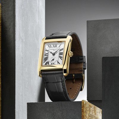 The design of the Frederique Constant Classics Carrée was inspired by the Art Deco movement of the 1920s and 1930s, with its straight, taut lines and elaborate geometric shapes. A style that - in a hundred years - has lost none of its appeal and remains popular among design and watch enthusiasts. The hour and minute hands tick along a "sector dial," also known as ‘railway track’, so typical of the era. An independent small seconds hand is inserted at 6 o'clock with a slight hollow plane. Another ‘Deco’ design element is the onion shaped crown, a tribute to the pocket watches that this type of wristwatch was slowly replacing as the everyday watch for everyone. As classic as the style is, underneath lies a modern Swiss FC-235 (based on Ronda 1064) movement for ultimate accuracy.