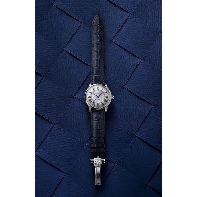 This Limited to 300 edition Classics Premiere watch is a perfect blend of tradition and modern elegance. Roman numeral applied hour markers and blue Breguet hands emphasize the classic style of the watch. The mother of pearl central section is decorated with a ring of diamonds for a touch of glamour. The watch is powered by an FC-301 (based on a G100 La Joux-Perret) movement, which offers a 68-hour power reserve. Through the transparent caseback, you can admire the Côtes de Genève pattern adorning the rotor. This particular watch is aimed at women, but we are sure the design will appeal to men as well.