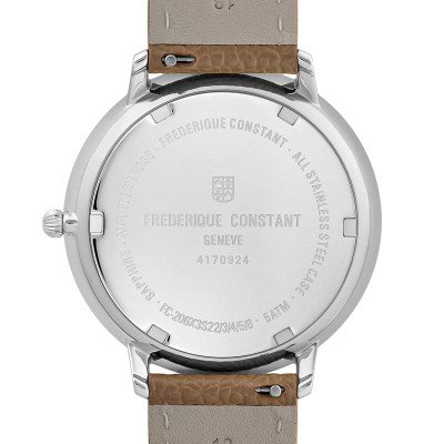 The Frederique Constant Classics Moonphase watch, is an accurate quartz timepiece that combines classic style with everyday functionality. The refined moon phase complication is perfectly positioned at 6 o’clock in the well balanced and highly readable dial with Roman numerals. The 39 mm polished gold plated case houses an FC-206 quartz movement with a battery life of no less than 60 months. An elegant and sophisticated watch for the man who appreciates the finer things in life.