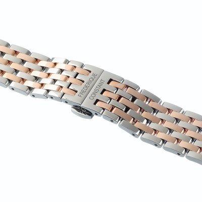 This Frederique Constant watch strap is made of stainless steel and is attached to the watch by means of push pins. The band has a width of 20 mm and is closed by means of a butterfly clasp with push buttons. The strap has no straight mount which means that this strap is only suitable for the watches listed below.