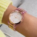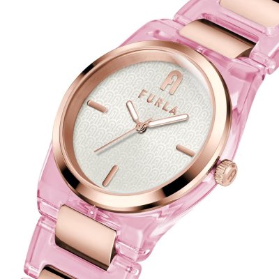 This Furla watch has a case made of Stainless steel and resin with a diameter of 34 mm and is fitted with a Stainless steel and resin strap. Inside the case lies a Miyota movement and the watch features a Mineral crystal.