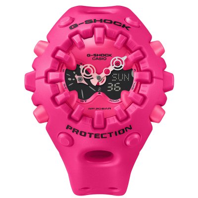 Sometimes you may think there's nothing left to improve on watches in the 21st century, but then you have not been paying attention to G-Shock. After forty years of constant innovation, the brand has once again managed to revolutionize the watch world with a completely unique and original design. With a completely new approach to construction and design, the GA-V01 not only has a spectacular appearance, but it's also supremely shock-resistant and conceals remarkable technical innovations: The case structure, which protects the movement, utilizes an integrated bezel and bracelet construction that partially overlaps the crystal, thus also acting as a bumper to absorb shocks. Casio has also developed a new magnetic hand construction, where the hands, normally vulnerable to impact, are not attached to the axle, but are held in place by magnetic force. This allows them to effectively absorb and dissipate shock. This new technology also allows for the creation of larger, uniquely shaped hands because the axle doesn't have to bear their weight. After a shock or vibration, the hands may temporarily shift out of position, but within a few minutes, they almost magically, return to their original position. The analog-digital dial features a layered construction with a metal face featuring lattice sections, creating decorative glimpses into the interior, and an LCD display. This watch is not for the risk-averse. It's striking, large, and sure to get people talking! And you're guaranteed a strong and powerful movement that keeps working, no matter whatever shocks and impact it may encounter!