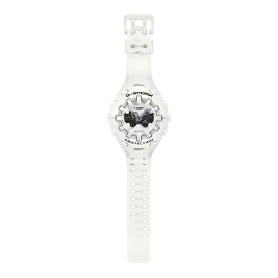 Sometimes you may think there's nothing left to improve on watches in the 21st century, but then you have not been paying attention to G-Shock. After forty years of constant innovation, the brand has once again managed to revolutionize the watch world with a completely unique and original design. With a completely new approach to construction and design, the GA-V01 not only has a spectacular appearance, but it's also supremely shock-resistant and conceals remarkable technical innovations: The case structure, which protects the movement, utilizes an integrated bezel and bracelet construction that partially overlaps the crystal, thus also acting as a bumper to absorb shocks. Casio has also developed a new magnetic hand construction, where the hands, normally vulnerable to impact, are not attached to the axle, but are held in place by magnetic force. This allows them to effectively absorb and dissipate shock. This new technology also allows for the creation of larger, uniquely shaped hands because the axle doesn't have to bear their weight. After a shock or vibration, the hands may temporarily shift out of position, but within a few minutes, they almost magically, return to their original position. The analog-digital dial features a layered construction with a metal face featuring lattice sections, creating decorative glimpses into the interior, and an LCD display. This watch is not for the risk-averse. It's striking, large, and sure to get people talking! And you're guaranteed a strong and powerful movement that keeps working, no matter whatever shocks and impact it may encounter!