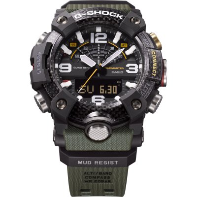 This G-Shock watch has a case made of Carbon with a diameter of 52.9 mm and is fitted with a Resin strap. Inside the case lies a Casio movement and the watch features a Mineral crystal.